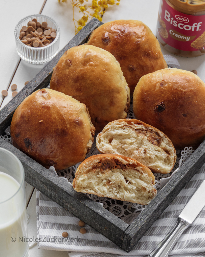 Die süßen Sauerteig-Brötchen sind mit Karamelldrops und Lotus Biscoff Creme* gefüllt. Beides kann natürlich gegen eure Lieblinge ausgetauscht oder auch ganz weg gelassen werden.
